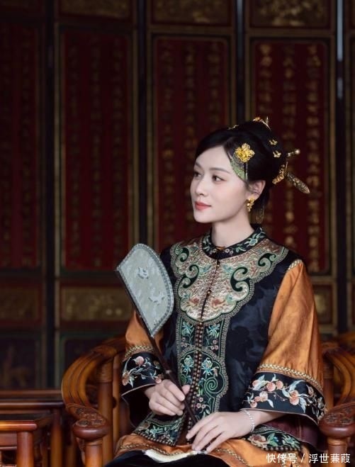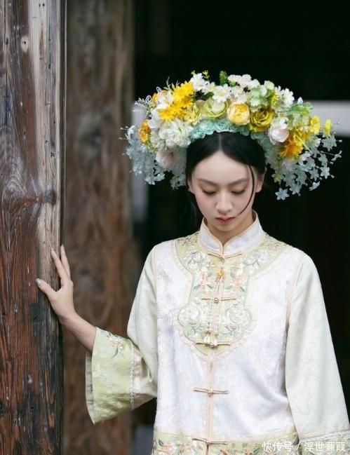 森碟则选择浅松绿双排扣对襟上衣配同色系阔摆裙,腰线收束利落,搭配粉白渐变茉莉簪花,笑意盈盈时眼波流转,青春气息跃然屏上。